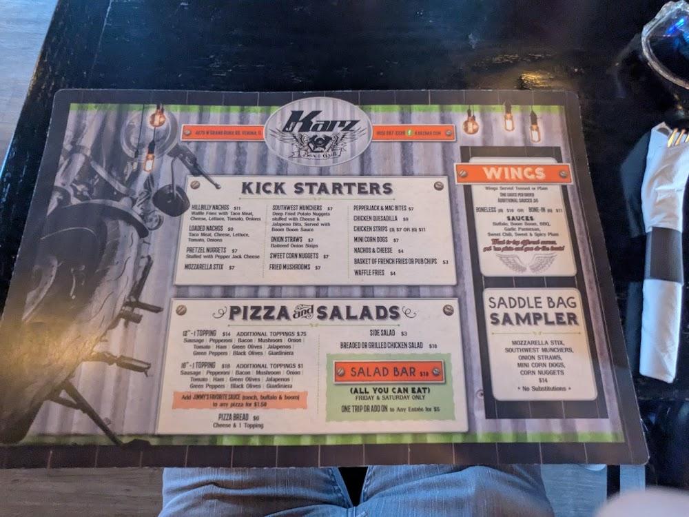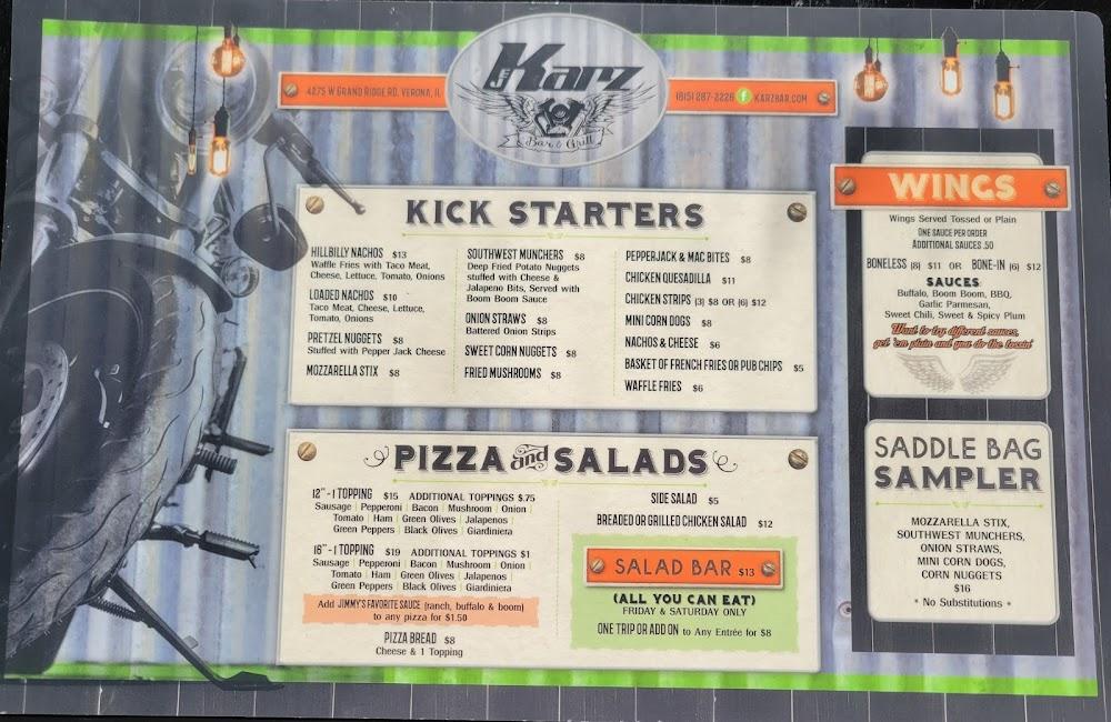 EJ Karz, located at 4275 W Grand Ridge Rd in Verona, IL, is your go-to bar for a vibrant night out. Enjoy a lively atmosphere featuring live concerts and a wide selection of cocktails and beers. With affordable prices ranging from $10 to $20, it's perfect for solo diners, groups, and tourists. Indulge in delicious food with options for dining in or takeout, and don’t miss the happy hour specials! The bar boasts a spacious terrace, quick service, and is wheelchair accessible. Whether you’re in for a drink, to catch a game, or enjoy some live music, EJ Karz promises a memorable experience.